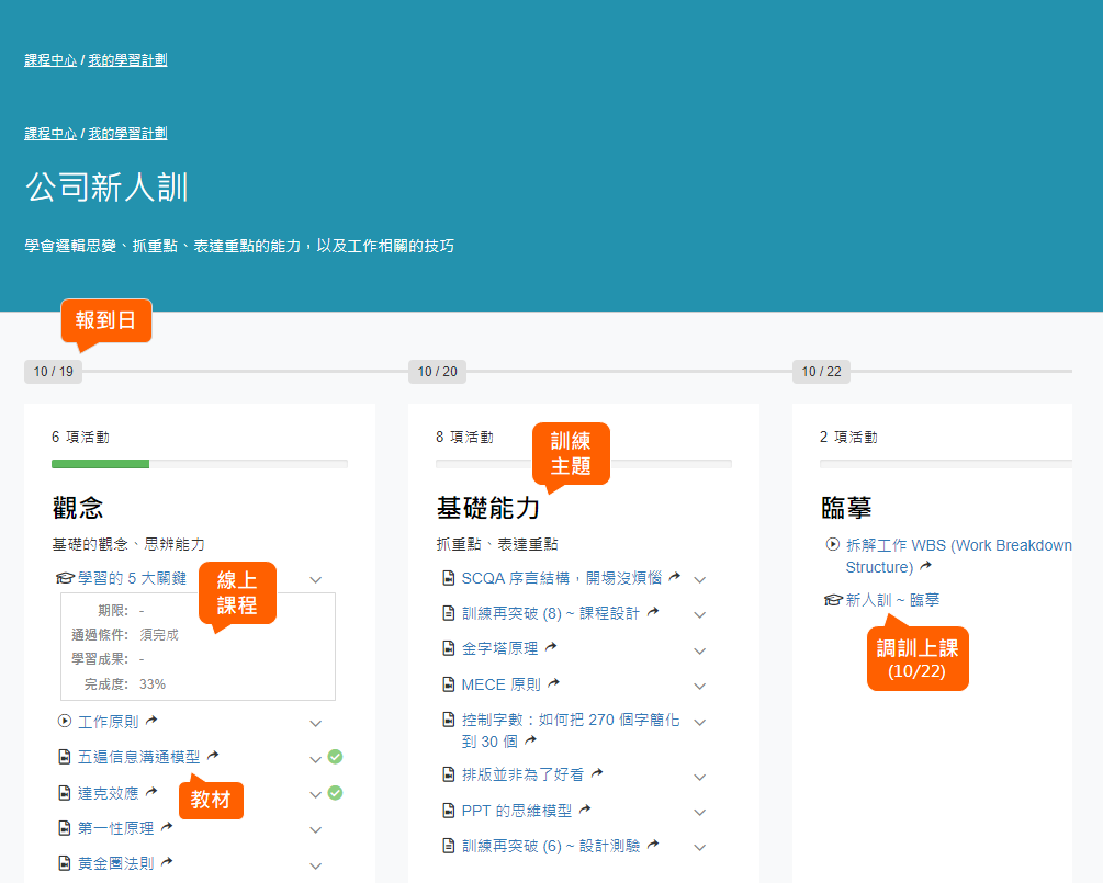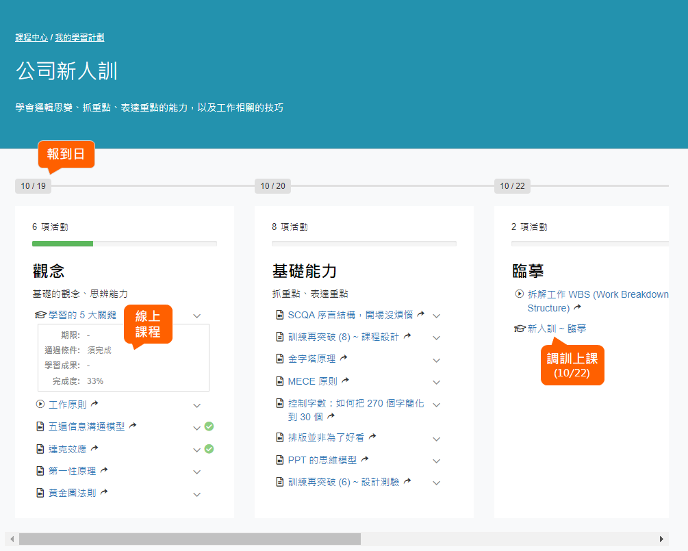 為了滿足新人訓的特性 ~ 每個人到職日不同、訓練內容大致相同但仍有小差異,學習計劃提供以下功能: