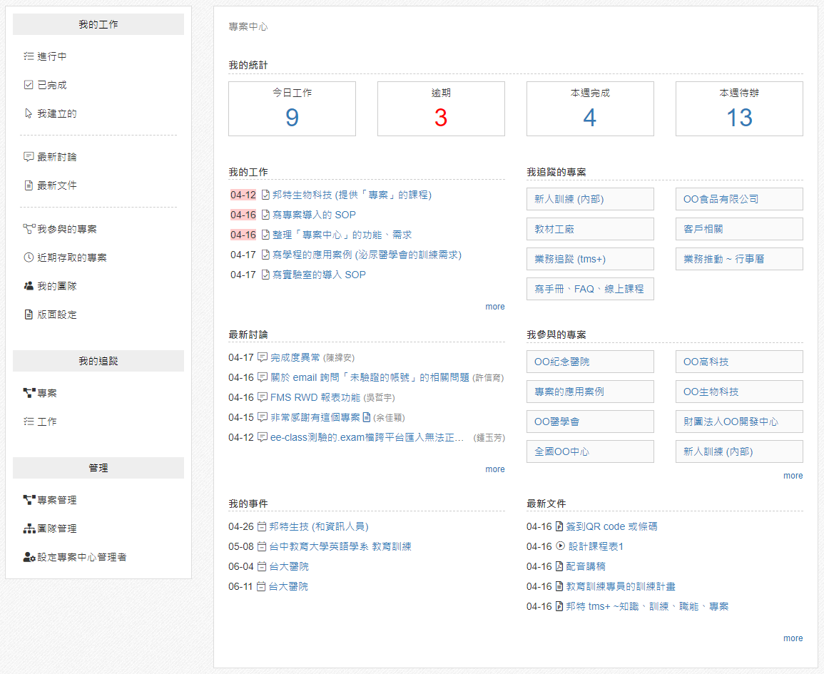 可以查看專案或團隊中成員的工作內容與最近紀錄詳細列表,快速瀏覽整體工作狀態,例如哪些工作已經過期,並從紀錄中快速得知原因。